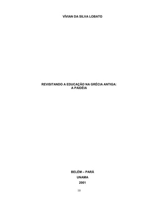 O documento faz uma contextualização histórica da Grécia Antiga, descrevendo as características do modo de produção escravista e a organização social e política. Em seguida, aborda a educação na Grécia, caracterizando o ideal educacional grego conhecido como Paidéia, e os períodos da filosofia grega. O objetivo é refletir sobre a educação grega e possíveis relações com a educação moderna.
