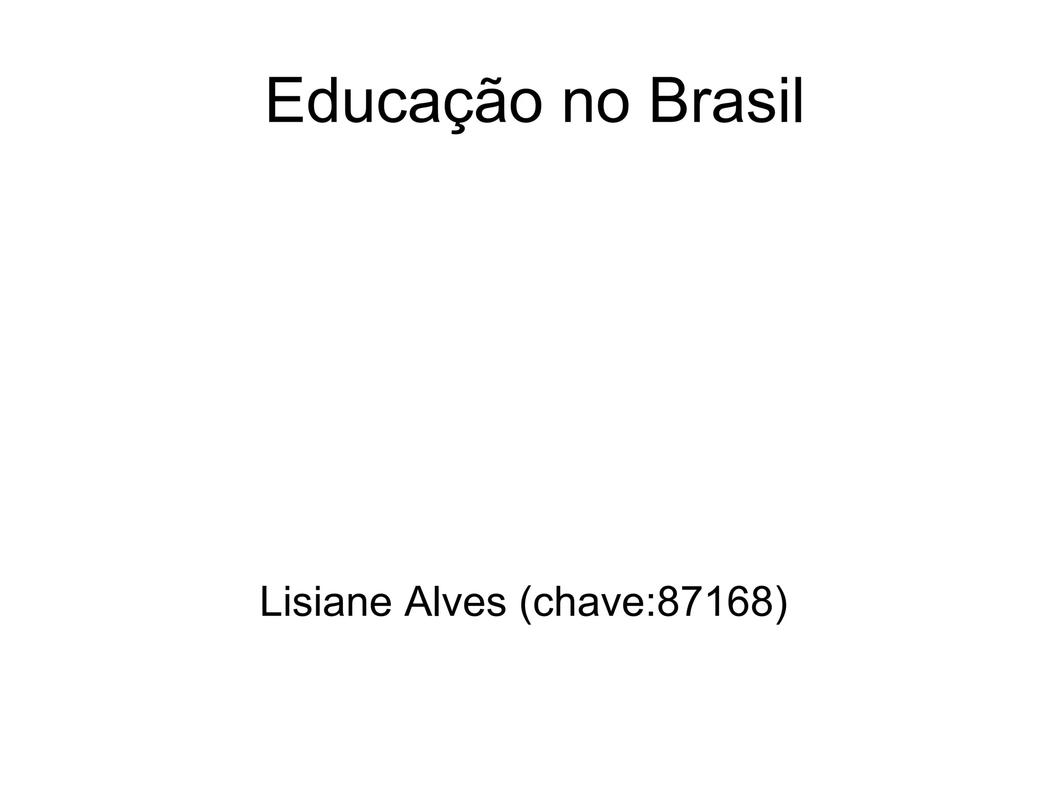 A educação no Brasil é gerida separadamente por cada nível de governo de acordo com a Constituição. A educação é um direito para todos e um dever do Estado de promover o desenvolvimento integral da personalidade humana. A educação é dividida em educação infantil, ensino fundamental obrigatório de 6 a 14 anos, ensino médio de 3 anos e ensino superior requerendo vestibular.