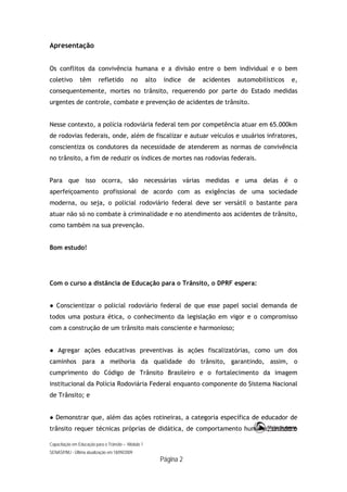 O documento discute a importância da educação para o trânsito realizada pelos policiais rodoviários federais. Apresenta a história dos materiais educativos sobre trânsito no Brasil e discute a necessidade de esses materiais refletirem valores democráticos e estimularem a reflexão sobre novas políticas de segurança pública. Também descreve os objetivos e módulos do curso de formação de educadores para o trânsito da Polícia Rodoviária Federal.