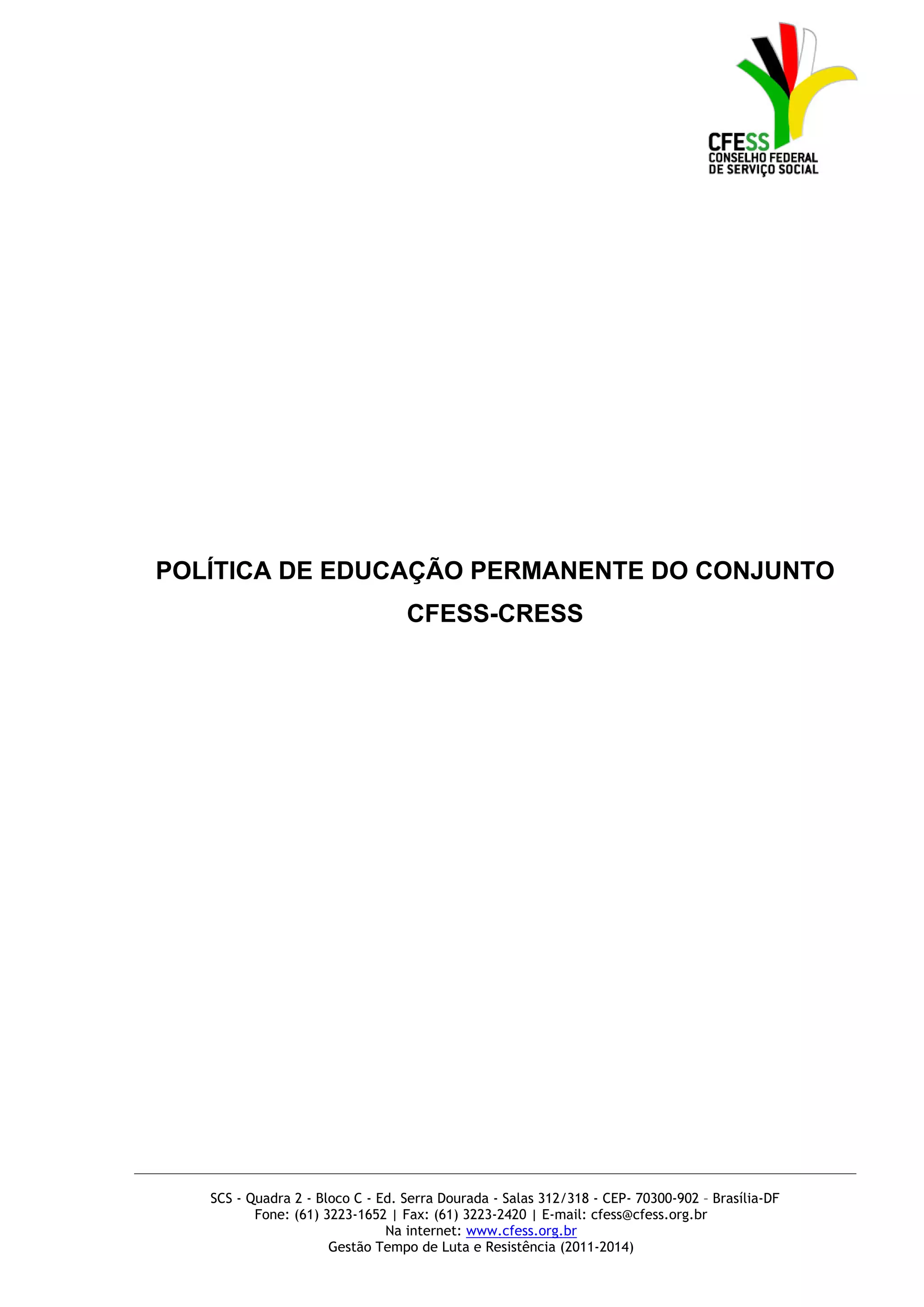 Este documento apresenta a Política de Educação Permanente do Conselho Federal de Serviço Social e dos Conselhos Regionais de Serviço Social. Ele destaca a importância da educação permanente para aprimorar a qualidade dos serviços prestados à população e para fortalecer a luta ideológica e política da categoria profissional em um contexto de transformações socioeconômicas. A política visa promover a formação continuada dos assistentes sociais por meio de diretrizes, objetivos e estratégias definidas em conjunto com associações represent