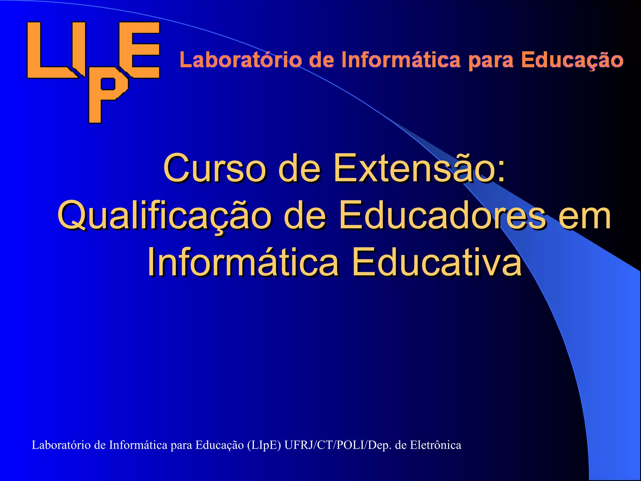 Este documento descreve um curso de extensão oferecido pelo Laboratório de Informática para Educação (LIpE) da UFRJ com o objetivo de qualificar educadores no uso da informática como ferramenta educacional. O curso utiliza metodologia participativa e aborda conceitos básicos de informática educativa, análise e planejamento de atividades pedagógicas com o uso de softwares educacionais.