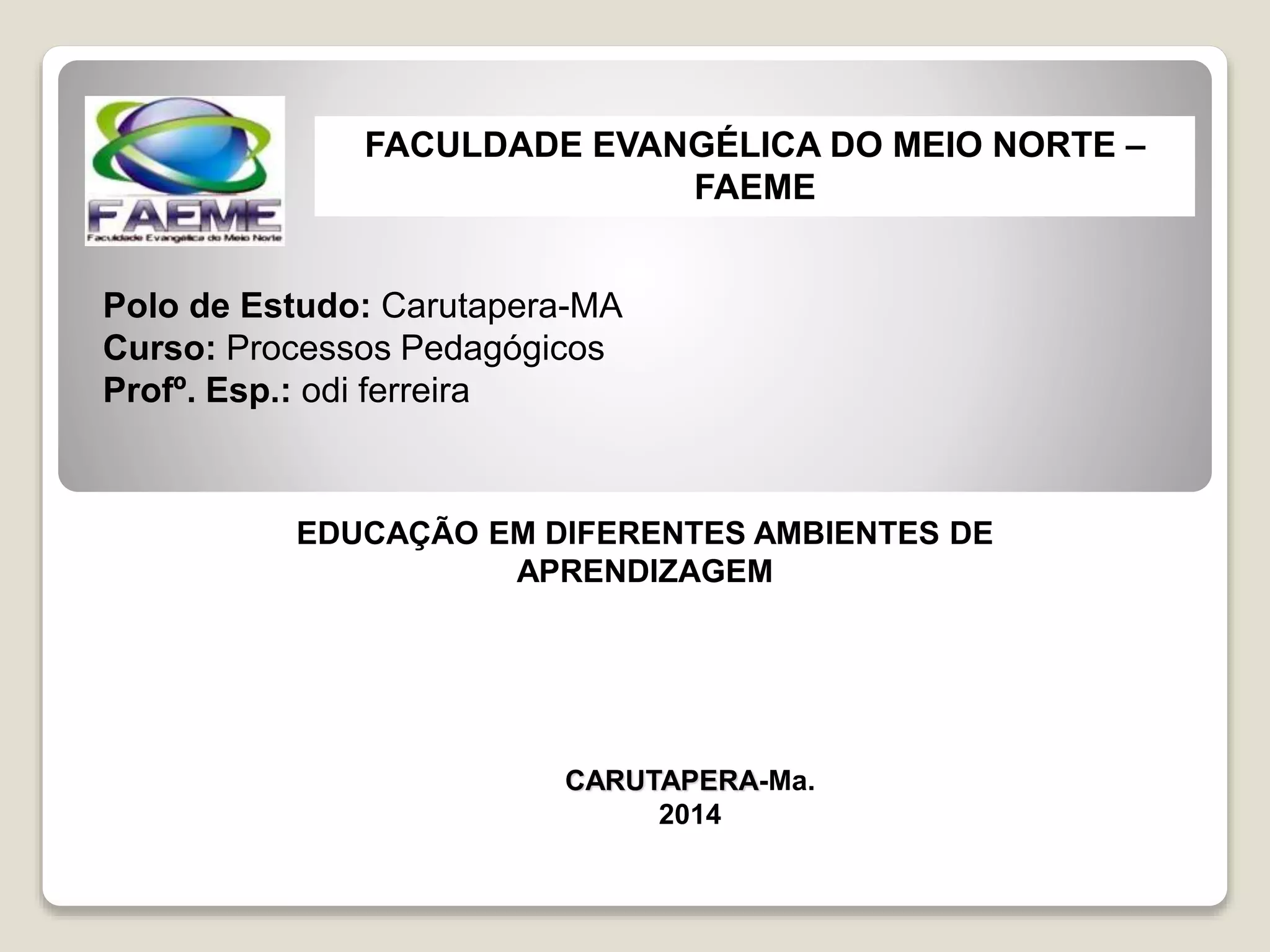 Este documento discute a educação em diferentes ambientes de aprendizagem, incluindo instituições escolares, ambientes hospitalares, empresas e educação a distância. Ele também aborda as especificidades educacionais de crianças, jovens, educação popular e a pedagogia libertária.