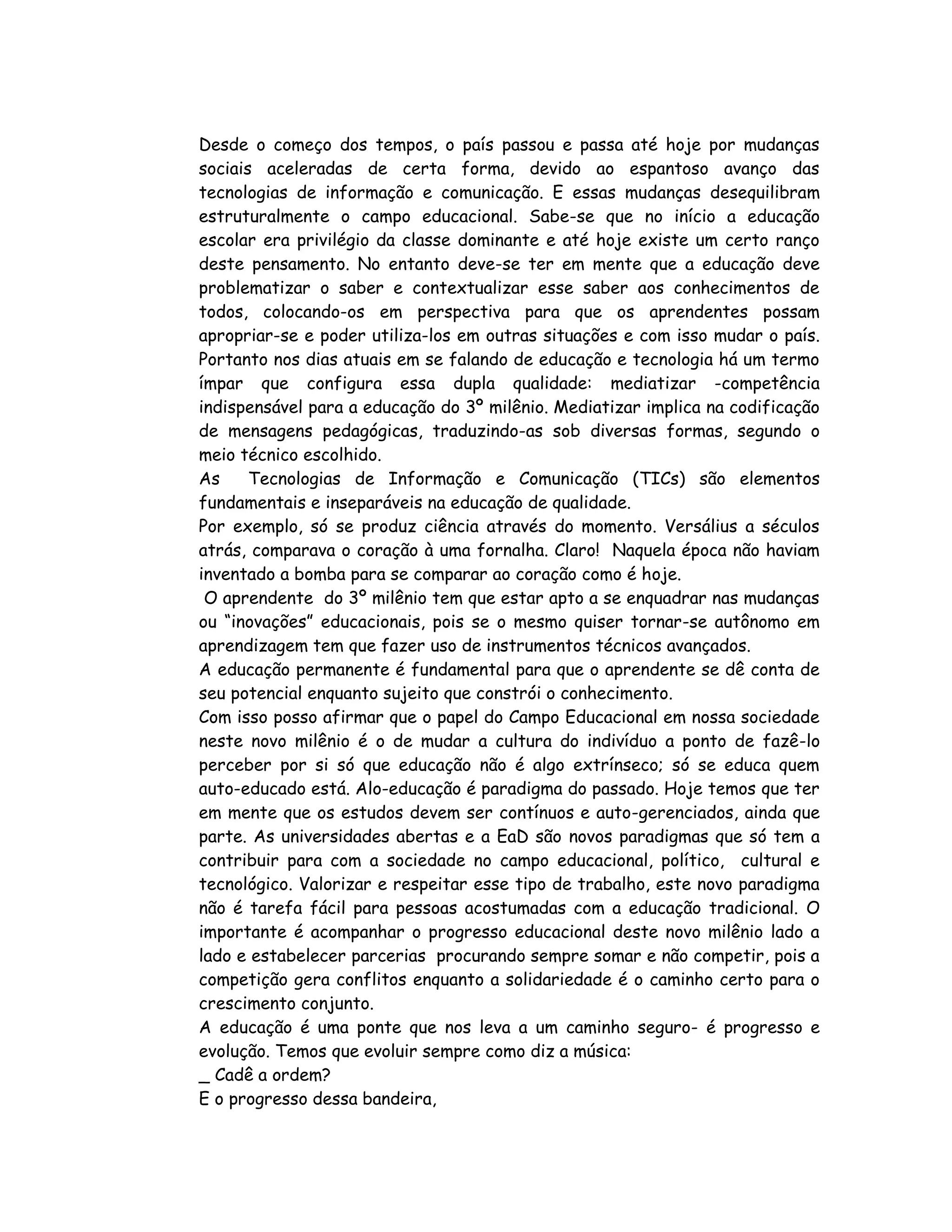A sociedade passa por rápidas mudanças devido à tecnologia, desafiando o sistema educacional. A educação deve capacitar todos com conhecimentos contextualizados para promover mudanças. No século 21, é essencial mediatizar mensagens pedagógicas usando diversos meios técnicos.