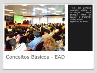 O documento resume os conceitos básicos da educação a distância (EAD), destacando que utiliza a tecnologia como principal meio de educar e transmitir conhecimento ao aluno de forma remota. Também aborda as características de um bom aluno de EAD e do papel do professor em motivar e esclarecer dúvidas dos estudantes à distância.