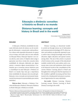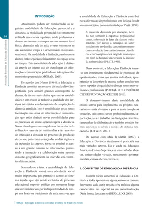 Este artigo discute a história e conceitos da educação a distância no Brasil e no mundo. Ele resume brevemente os principais conceitos de educação a distância propostos por autores-chave e enumera alguns marcos históricos importantes no desenvolvimento da educação a distância, como o Instituto Líber Hermondes na Suécia em 1829 e a Divisão de Ensino por Correspondência da Universidade de Chicago em 1892.