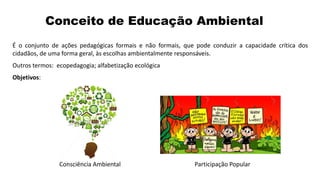 O documento discute a educação ambiental, começando com suas definições e objetivos. Também aborda a história do movimento ambientalista e como ele influenciou o desenvolvimento da educação ambiental. Por fim, fornece diretrizes para o planejamento de programas de educação ambiental.
