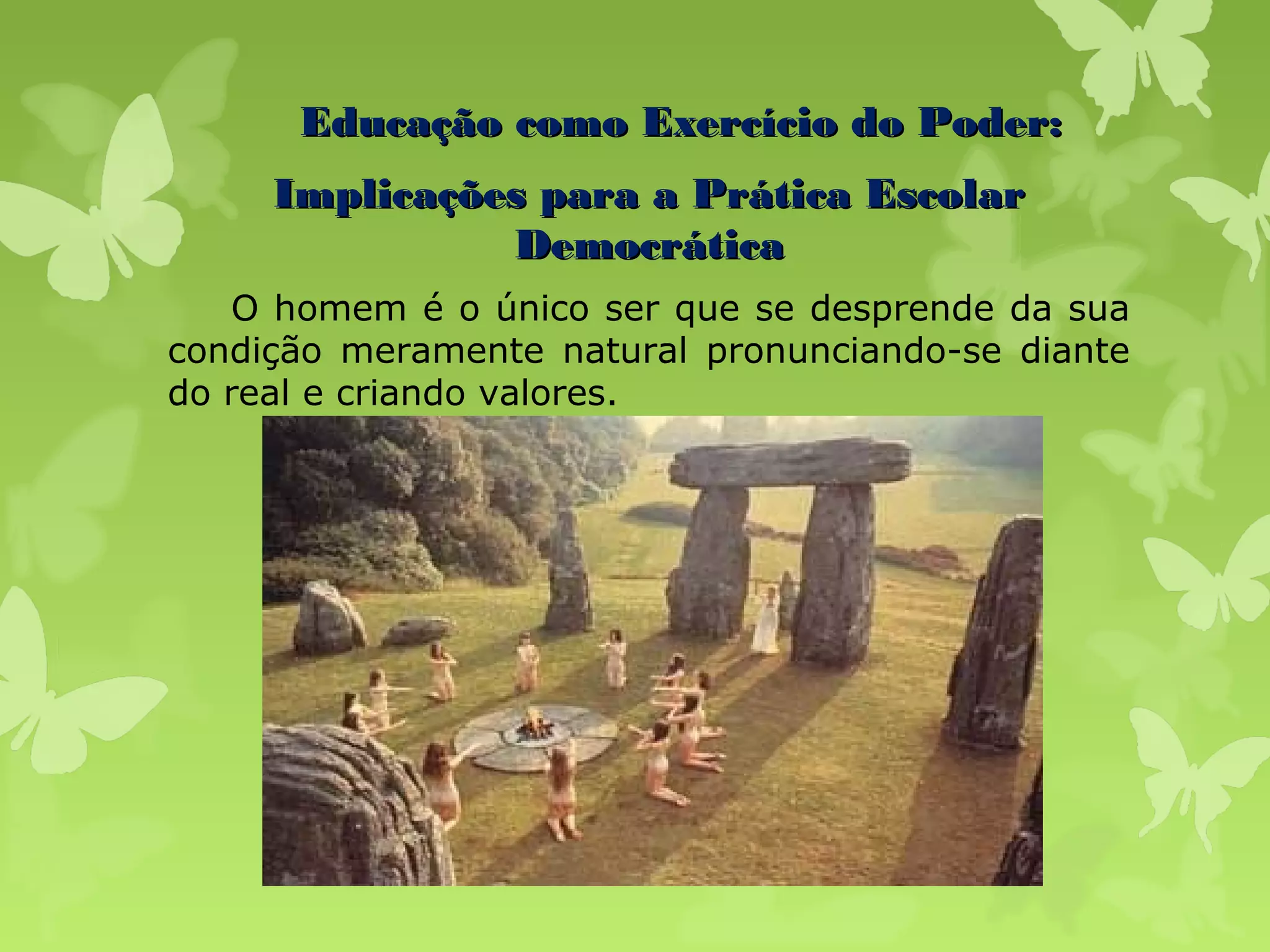 O documento discute a educação como forma de preparar os estudantes para serem cidadãos democráticos. Argumenta que os seres humanos se tornam mais humanos à medida que adquirem cultura e que a educação deve se preocupar com o desenvolvimento do homem como um todo, incluindo seus valores democráticos. Defende que a educação deve formar os estudantes como sujeitos capazes de atuar democraticamente na sociedade.