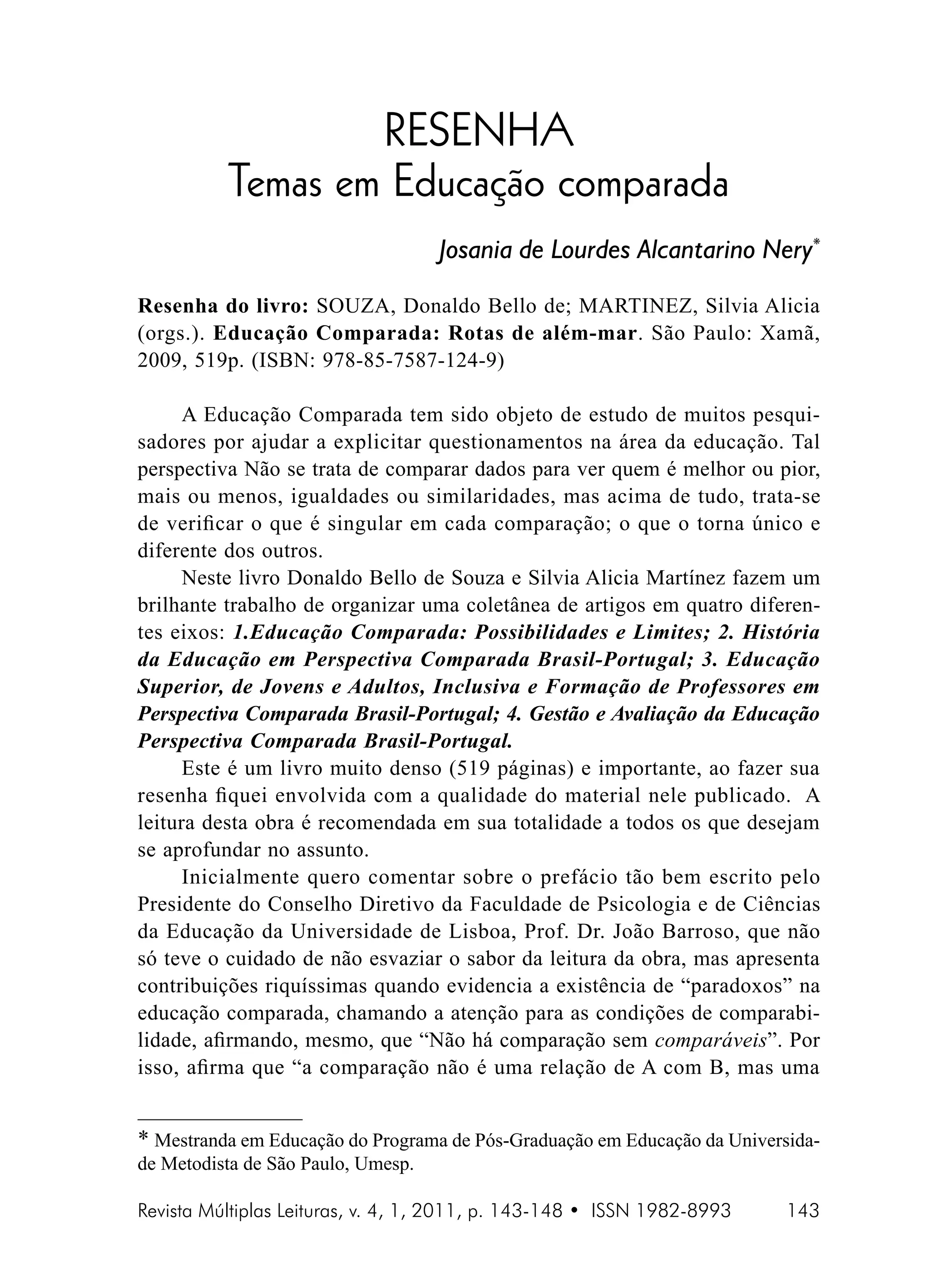 Este documento resume um livro sobre educação comparada entre Brasil e Portugal. O livro contém artigos sobre história da educação, educação superior, inclusão e formação de professores nos dois países. A obra fornece uma análise valiosa das semelhanças e diferenças entre os sistemas educacionais brasileiro e português.