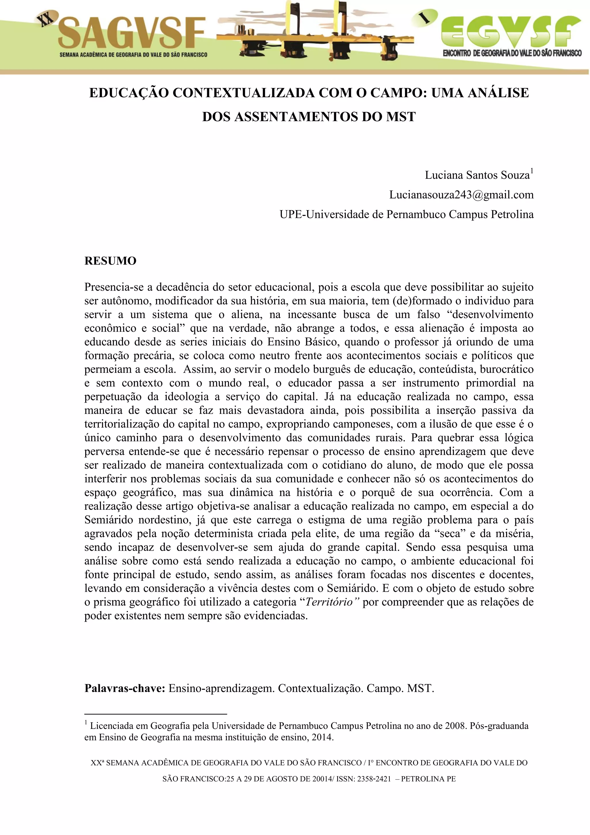 1) O documento analisa a educação contextualizada realizada no assentamento São Francisco no Vale do Salitre na Bahia, onde os professores trabalham os conteúdos a partir da realidade local e levam os alunos para aulas externas.