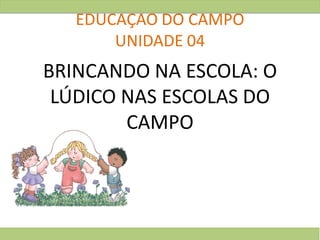 O documento discute a importância do lúdico no processo de alfabetização de crianças dos povos do campo. Ele explica como os jogos podem auxiliar na apropriação do sistema de escrita alfabética ao mesmo tempo em que valorizam as singularidades desses povos. O documento fornece exemplos de jogos e atividades que podem ser usados em sala de aula para ensinar leitura, escrita e conteúdos relacionados ao campo de forma lúdica.