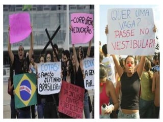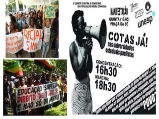 O documento discute as cotas universitárias no Brasil. Ele apresenta os objetivos de ampliar o acesso ao ensino superior para alunos de escola pública e negros, e justifica a necessidade de medidas para promover a inclusão de grupos historicamente excluídos. Há opiniões tanto a favor quanto contra as cotas, debatendo seus potenciais benefícios e preocupações sobre seu impacto.