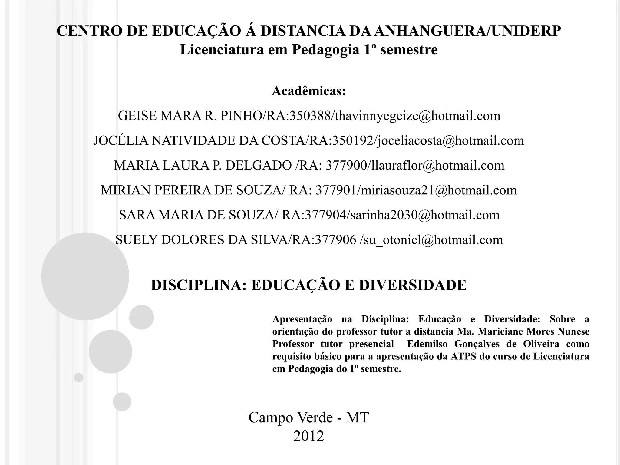 O documento apresenta um resumo de 6 acadêmicos do curso de Licenciatura em Pedagogia sobre situações de diversidade e direitos humanos vividas em escolas durante estágios. Os acadêmicos relataram casos de discriminação racial, homofobia e deficiência onde educadores promoveram a conscientização sobre respeito às diferenças.