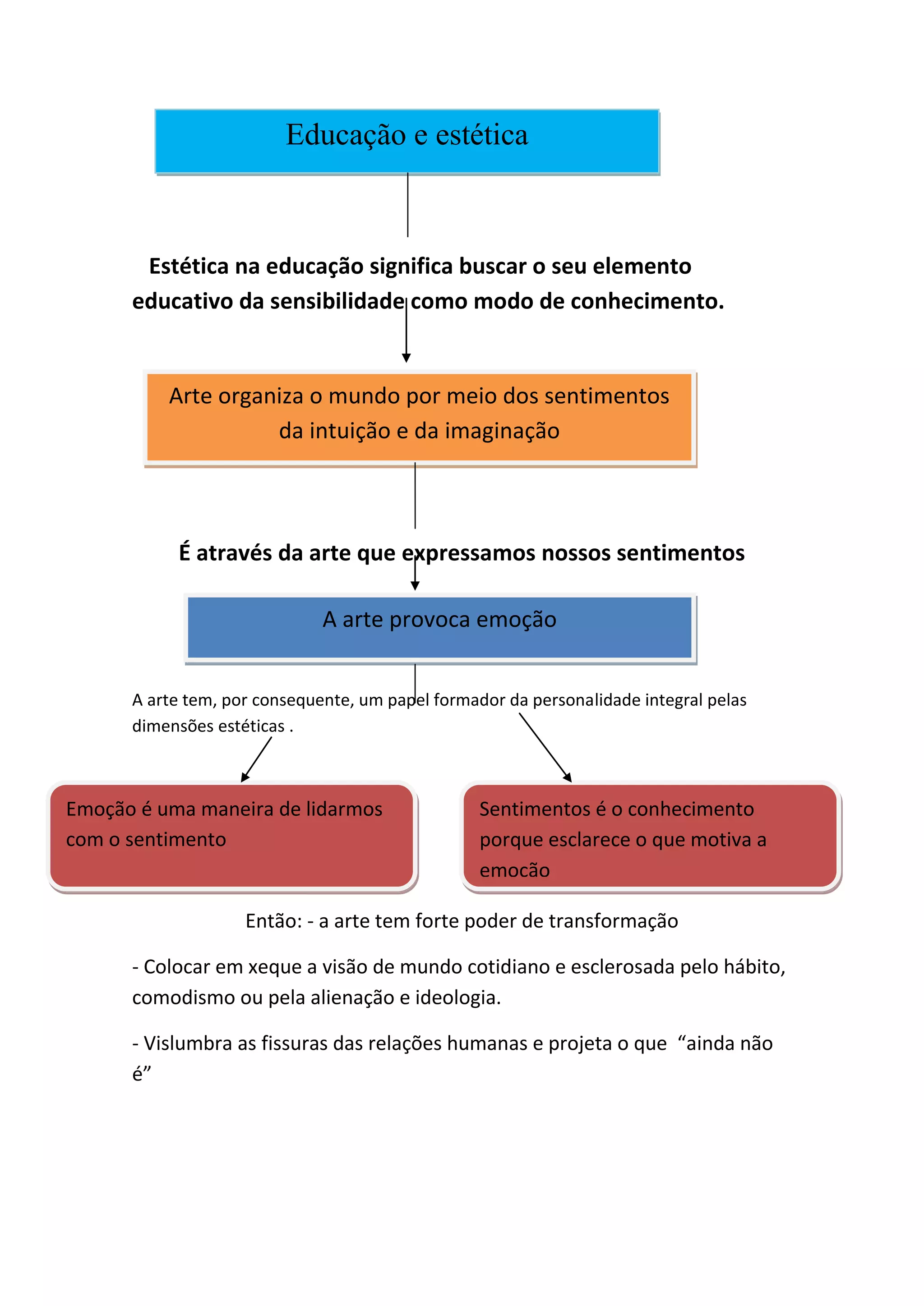 O documento discute como a estética e a arte são importantes na educação, transformando a visão de mundo das pessoas e organizando o mundo por meio dos sentimentos, intuição e imaginação. A arte provoca emoção e esclarece os sentimentos que motivam a emoção, sendo uma forma de conhecimento.