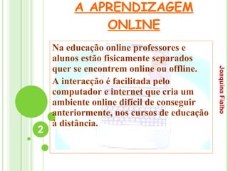 O documento discute a aprendizagem online e o papel do professor e dos alunos nesse contexto. Aprendizagem online envolve interação entre professores e alunos mesmo quando fisicamente separados, com foco na aprendizagem colaborativa. O papel do professor inclui criar materiais e um ambiente social de aprendizagem para incentivar discussões e dar feedback. A proximidade do professor é fator importante para a motivação dos alunos.