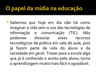 O documento discute a importância de incorporar as tecnologias de informação e comunicação no ensino para aproveitar os recursos que fazem parte da vida dos alunos. Também ressalta a necessidade de preparar os estudantes para o mercado de trabalho do futuro, valorizando a criatividade e capacidade de resolver problemas. Cita ainda a importância de orientar os alunos sobre os perigos da internet e incentivar produções midiáticas na escola.