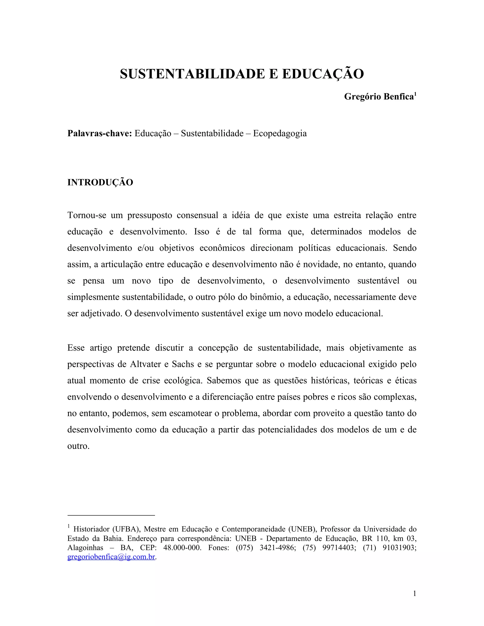 Este documento discute a relação entre sustentabilidade e educação. Apresenta diferentes perspectivas sobre o conceito de sustentabilidade, como a visão de Altvater de que o capitalismo é incompatível com a sustentabilidade. Também discute a necessidade de uma "ecopedagogia" que forme uma consciência ecológica e promova o desenvolvimento sustentável.
