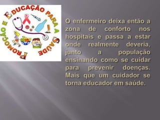O documento discute a evolução da enfermagem no Brasil, desde as práticas iniciais baseadas em instintos até a necessidade de especialização na década de 1990. Também aborda a importância da educação em saúde para a população, respeitando suas crenças e promovendo a autonomia. Por fim, destaca o desafio dos enfermeiros educadores em manter a confiança da população por meio de ações que melhorem a saúde e qualidade de vida.