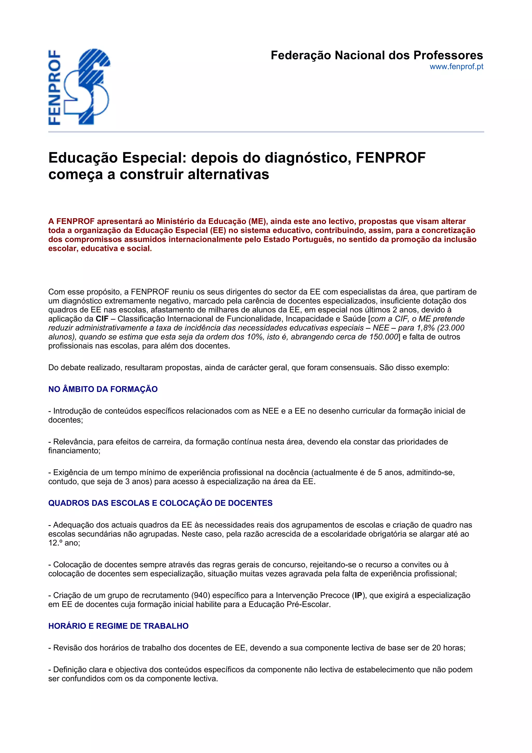 Este documento discute as propostas da FENPROF para reformar a Educação Especial em Portugal. A FENPROF reunir-se-á com especialistas para desenvolver propostas para melhorar a formação de professores, aumentar os quadros docentes nas escolas, e substituir as leis e sistemas atuais para promover a inclusão de estudantes com necessidades educacionais especiais. As propostas serão apresentadas ao Ministério da Educação ainda neste ano letivo.