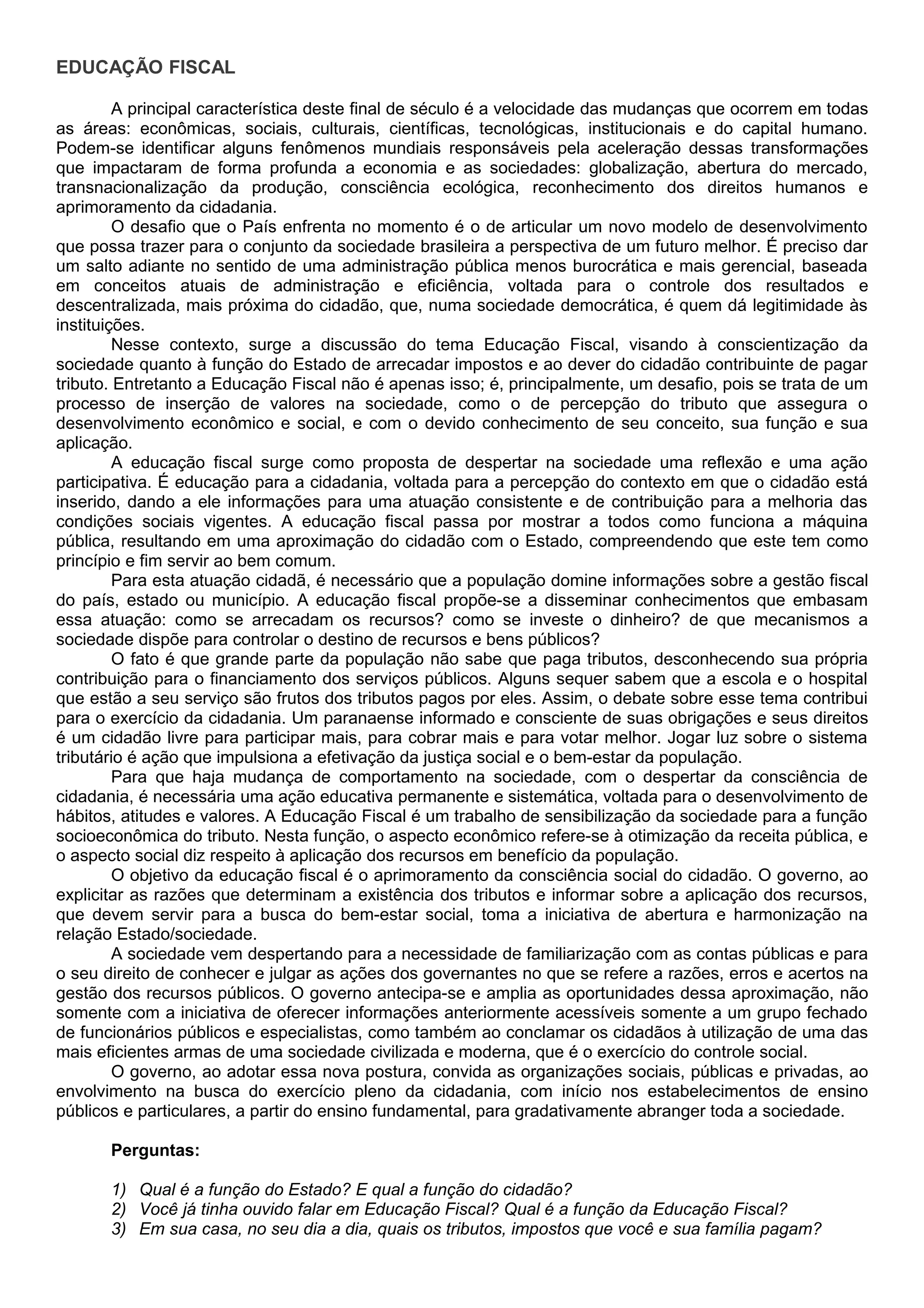 O documento discute a importância da Educação Fiscal para conscientizar os cidadãos sobre o pagamento de tributos e o uso desses recursos pelo Estado para o desenvolvimento econômico e social. A Educação Fiscal visa informar a população sobre como o sistema tributário funciona e despertar o senso de cidadania para que as pessoas possam cobrar a aplicação correta dos tributos que pagam.
