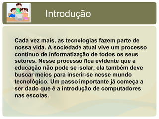 O documento discute a importância da educação informatizada e do uso de computadores na escola. Ele argumenta que as tecnologias fazem parte da sociedade atual e que a educação deve acompanhar essa informatização. Também descreve como o computador pode contribuir positivamente para o desenvolvimento cognitivo dos alunos e tornar o processo de aprendizagem mais ativo e exploratório.