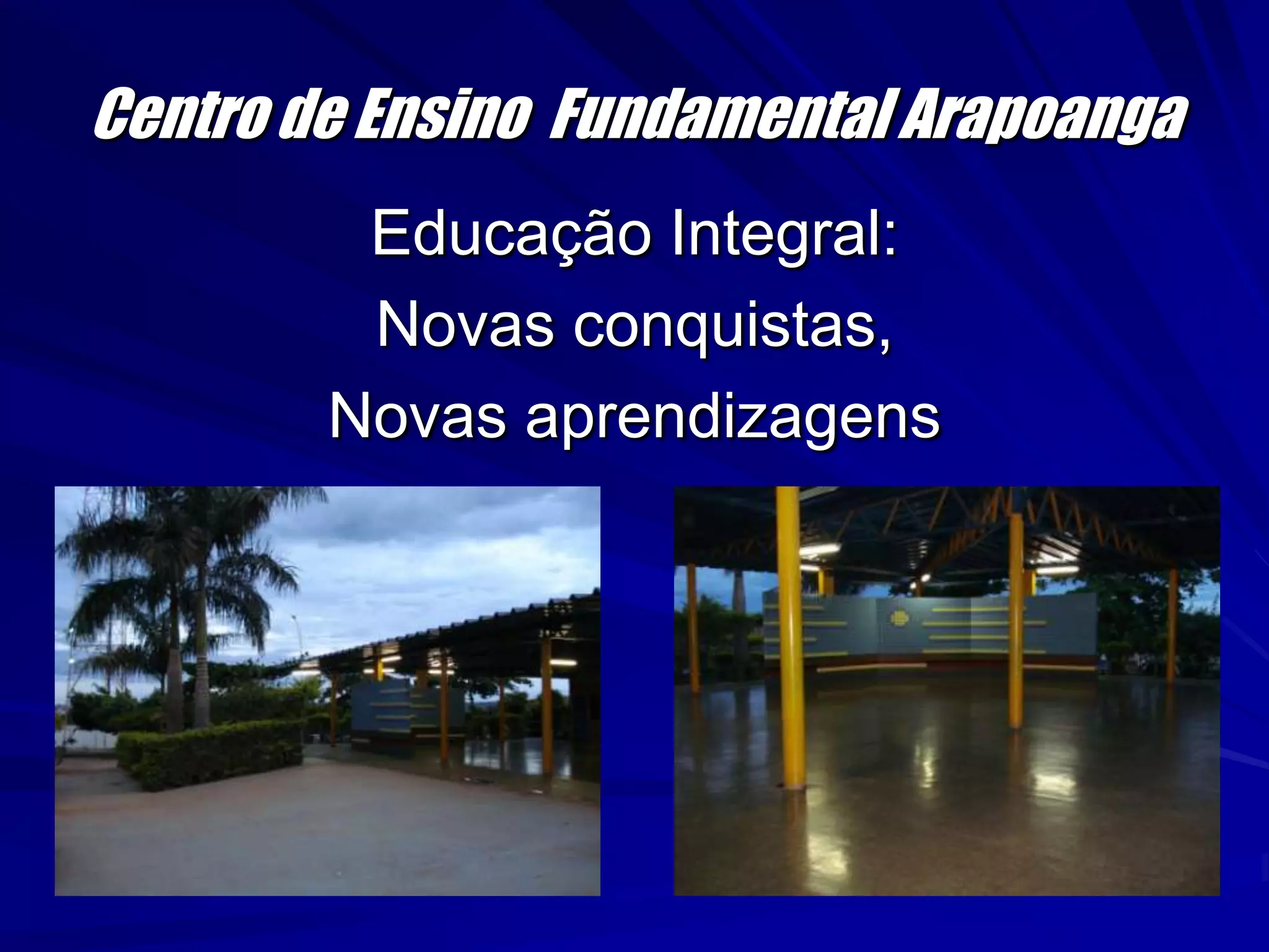 O documento discute as novas conquistas e aprendizagens da escola fundamental Arapoanga, que busca tornar a escola uma fonte de aprendizagens significativas e prazerosas através da integração, criatividade, motivação e estímulo dos alunos. A escola oferece aulas de reforço, teatro e recreação durante a semana para promover a diversidade, integração e socialização na aprendizagem.