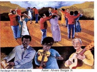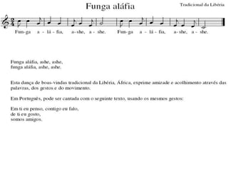 O documento apresenta diversas músicas e cantigas populares brasileiras, abordando temas como o som no dia a dia, brinquedos, rodas infantis, samba, chorinho e a organização musical. As letras descrevem aspectos culturais e sonoridades típicas de diferentes regiões do país.