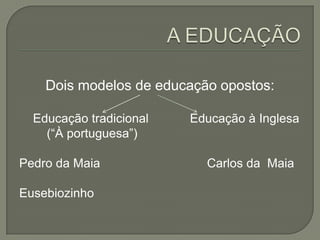 Este documento compara dois modelos de educação - a tradicional portuguesa versus a educação inglesa. A educação portuguesa enfatiza a memorização, moral religiosa e latim, enquanto a educação inglesa valoriza a saúde física, aprendizagem prática e línguas vivas. Apesar da educação inglesa de Carlos da Maia, ele fracassou devido à sociedade ociosa e paixão romântica, não por falhas em sua educação.