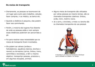 O documento discute a importância da educação no trânsito para promover o respeito entre pedestres e motoristas. Ele descreve como os meios de transporte evoluíram para atender às necessidades de locomoção humana e como o crescimento populacional e do trânsito trouxeram problemas como congestionamentos e acidentes devido à falta de educação no trânsito. A educação no trânsito começa com o respeito mútuo e o entendimento dos sinais e normas para uma circulação segura de todos.