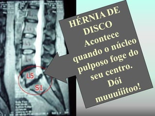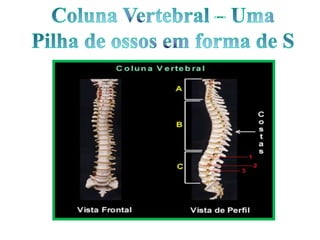 O documento discute problemas de coluna vertebral, afirmando que a maioria das pessoas terá ou já teve dores nas costas. A má postura desde a infância causa problemas para a vida toda. Problemas de coluna são uma das principais causas de afastamento do trabalho. O texto então lista vários hábitos diários que podem prejudicar a coluna e fornece dicas para melhorar a postura.
