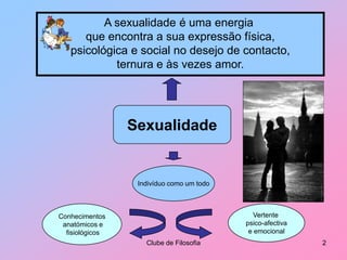 O documento discute vários aspectos da sexualidade humana, incluindo: (1) A sexualidade humana é menos determinada biologicamente do que em outros animais e depende mais da aprendizagem; (2) A identidade de género tem componentes biológicos e culturais; (3) A saúde mental é essencial para uma vida sexual satisfatória.