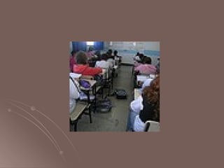 A educação tradicional é centrada no professor, com os alunos em papéis passivos de apenas ouvir enquanto estão organizados em filas. O professor transmite conteúdos prontos sem dar liberdade para a criação, enquanto os alunos estão limitados a apenas escutar e repetir.