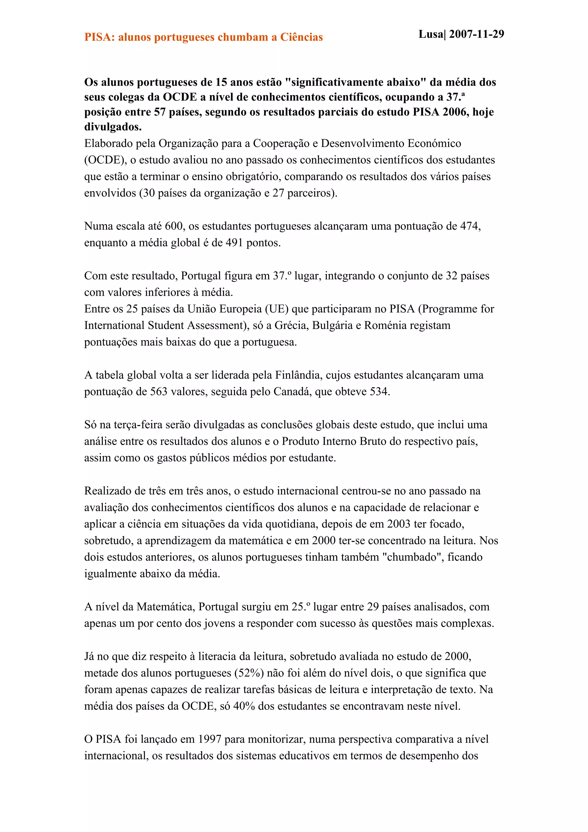 Os alunos portugueses de 15 anos obtiveram uma pontuação abaixo da média da OCDE no estudo PISA de 2006 sobre conhecimentos científicos, colocando Portugal em 37o lugar entre 57 países. A média portuguesa foi de 474 pontos contra 491 da OCDE. Nos estudos anteriores de 2003 e 2000, Portugal também ficou abaixo da média em matemática e leitura.