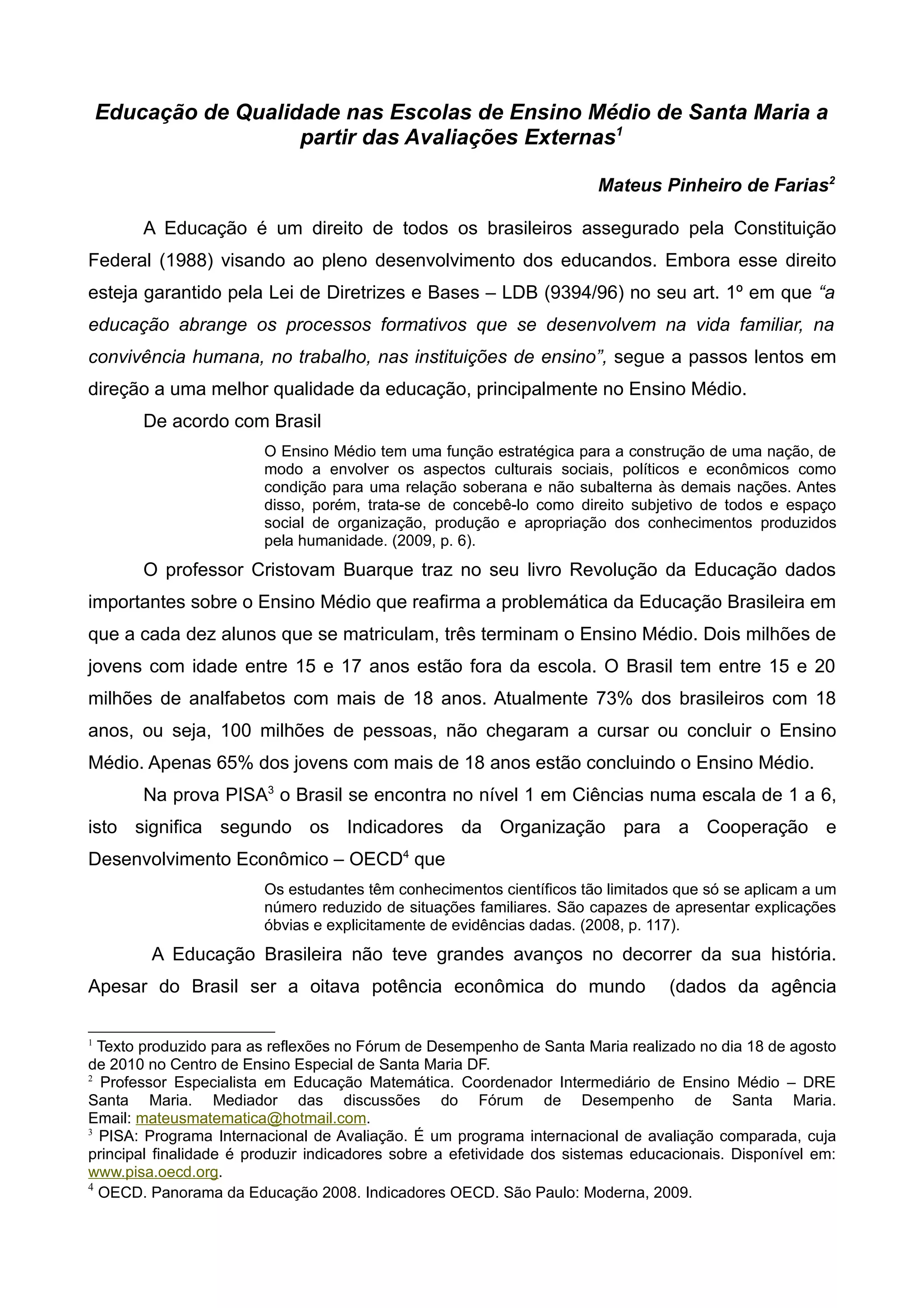 1. O documento discute a qualidade da educação no ensino médio brasileiro e em Santa Maria, com base em indicadores como IDEB e IDDF.