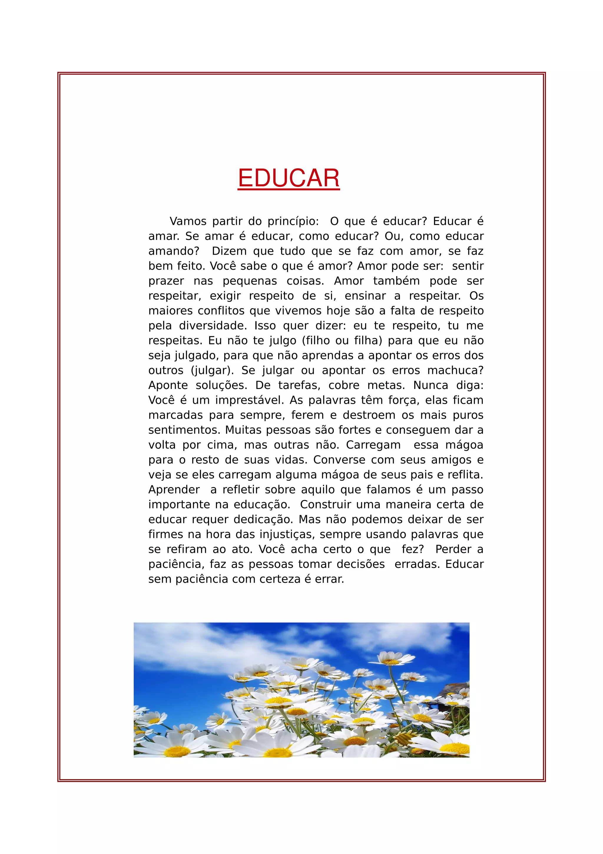 Educar é amar e respeitar. Para educar bem, é preciso respeitar a diversidade dos outros, não julgá-los, e apontar soluções em vez de erros. As palavras têm poder e podem ferir as pessoas para sempre, então é importante refletir sobre o que se fala e ser paciente, ainda que firme contra injustiças.