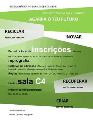 O projeto "Educar para o Futuro" da Escola Básica Integrada de Colmeias terá inscrições de 20 a 24 de setembro na reprografia com a D. Rosa. O projeto visa alunos do 6o ano em diante e funcionará na sala C4 das 15:40 às 16:25 sob a coordenação de Paula Cristina Morgado.