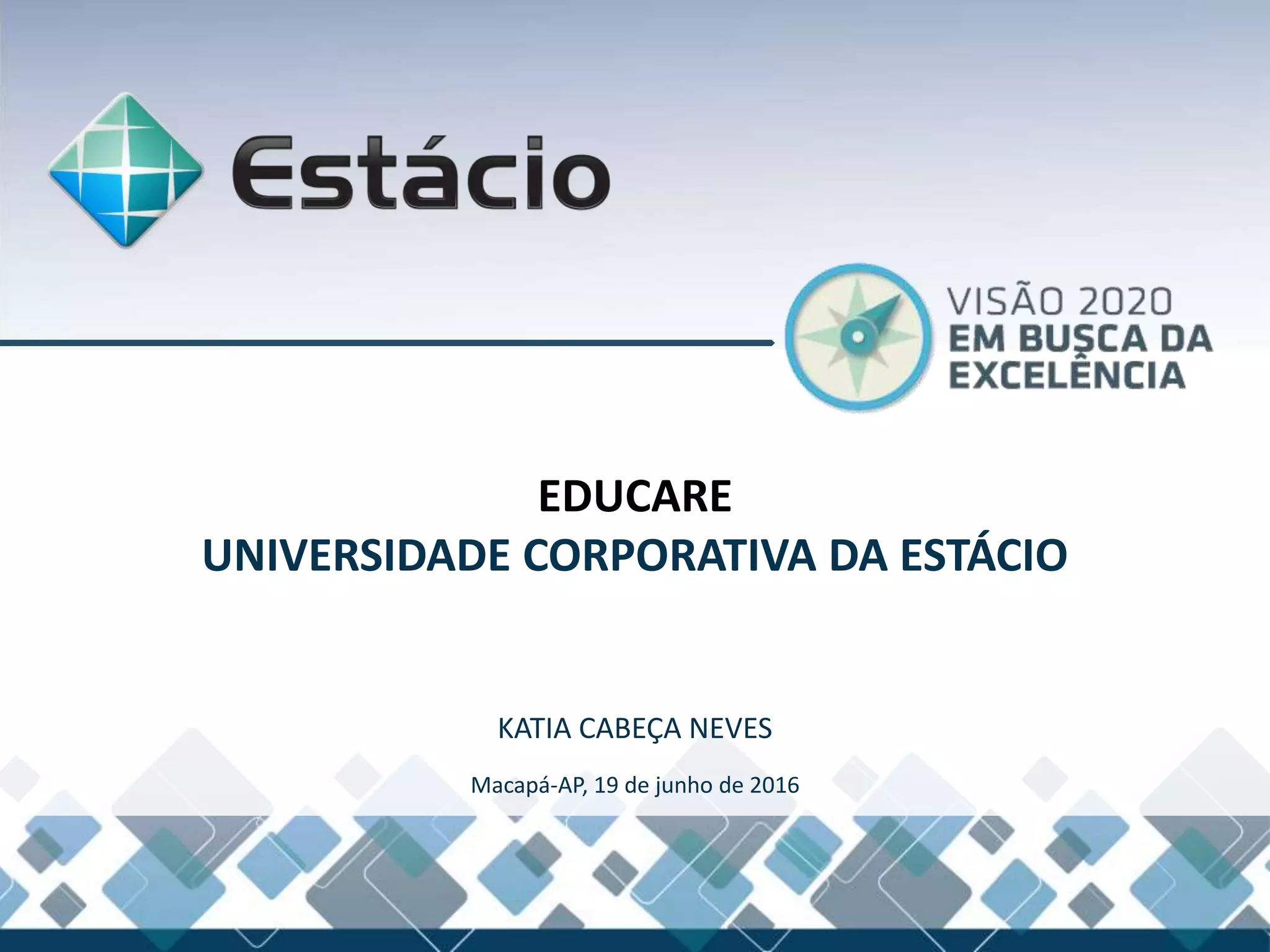 O documento discute a Educare, a universidade corporativa da Estácio, que visa melhorar o desempenho da empresa através do desenvolvimento contínuo de competências dos colaboradores. A Educare oferece programas educacionais para disseminar a cultura da empresa e estimular o aprimoramento de competências, rede de contatos e compartilhamento de conhecimento entre os funcionários. Seus principais objetivos são disseminar a cultura da Estácio e desenvolver administrativos e professores por meio de treinamentos técnicos e comportamentais.