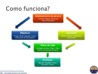 O coaching é um processo que visa aumentar o desempenho de indivíduos através de técnicas conduzidas por um profissional em parceria com o cliente, ajudando-o a alcançar objetivos de forma a liberar seu potencial de maneira consciente. Surgiu na área esportiva nos EUA na década de 70 e pode ser aplicado em diferentes áreas como esporte, negócios, carreira e vida.