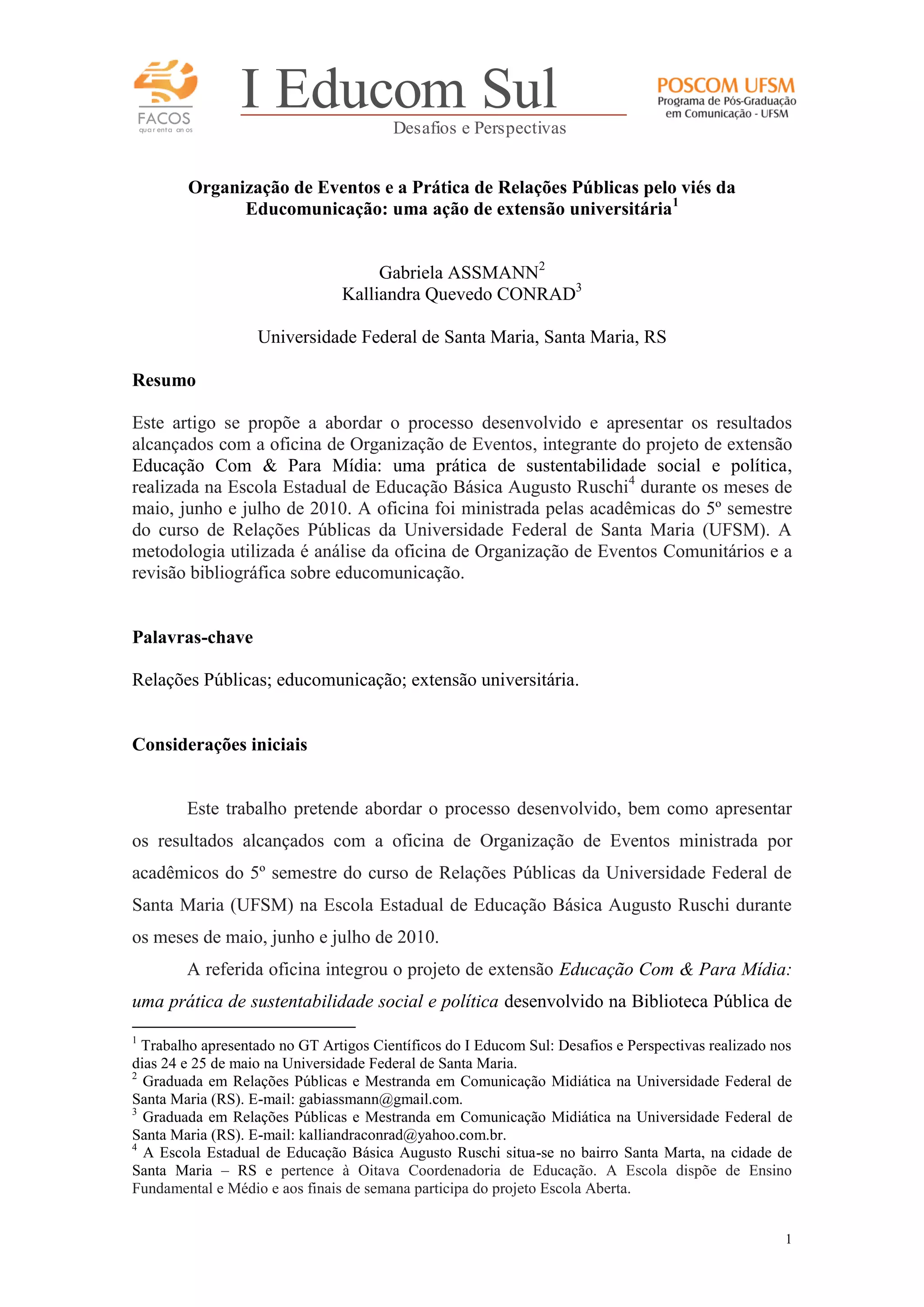 Este artigo descreve uma oficina de organização de eventos realizada por estudantes de Relações Públicas em uma escola. A oficina visava empoderar comunicacionalmente os alunos para que pudessem planejar e organizar eventos comunitários. A metodologia utilizada foi a educomunicação, que enfatiza a participação ativa dos envolvidos. O artigo discute como a oficina contribuiu para os objetivos do projeto de extensão, como proporcionar uma experiência prática de comunicação e políticas públicas aos estudantes de comunicação.