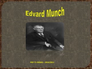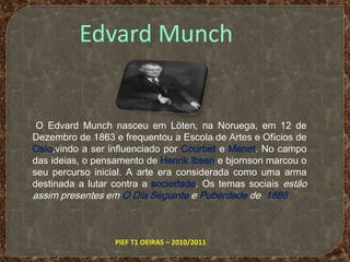 Edvard Munch nasceu na Noruega em 1863 e estudou arte, sendo influenciado por Courbet e Manet. Sua obra explora temas como doença, morte e angústia, inspirados por sua infância e decepções amorosas. Sua obra mais famosa, O Grito, retrata a angústia humana e faz parte de sua série O Friso da Vida, que recorre a figuras distorcidas e temas sobre fragilidade da vida.