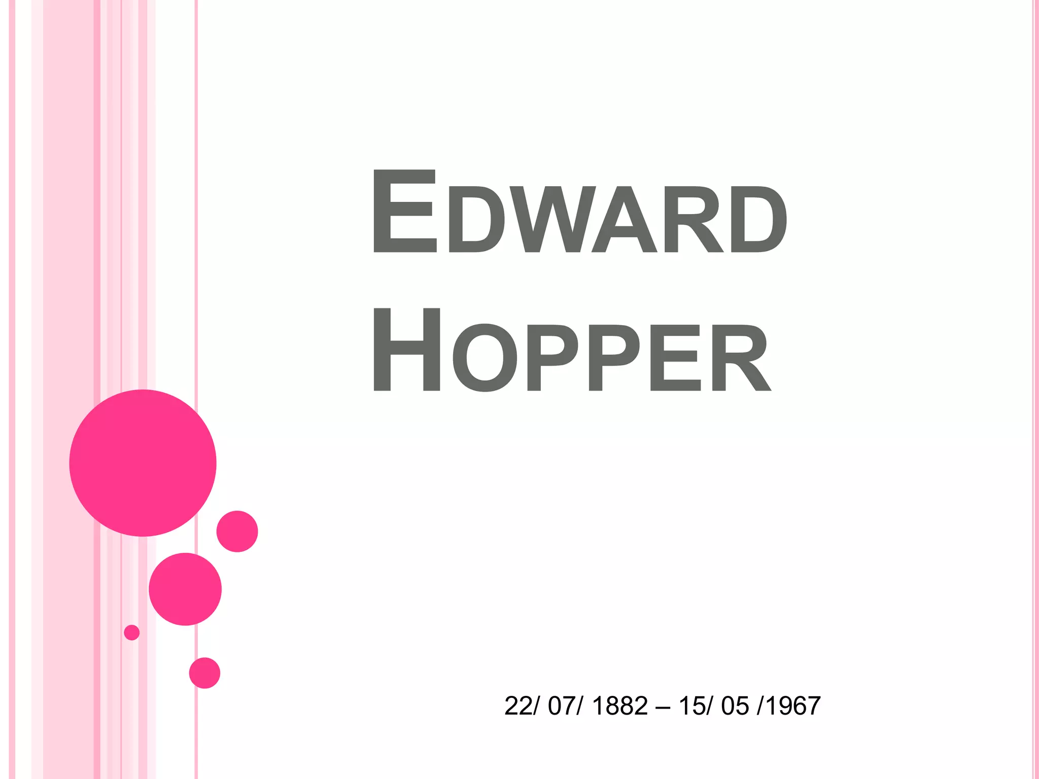 Edward Hopper (1882-1967) foi um pintor norte-americano conhecido por suas representações realistas da solidão na vida moderna através de paisagens urbanas e rurais desertas. Seus temas frequentemente mostravam figuras anônimas isoladas em cenários iluminados de forma estranha. Embora tenha recebido pouca atenção em vida, Hopper teve grande influência na arte e cultura pop posteriormente.