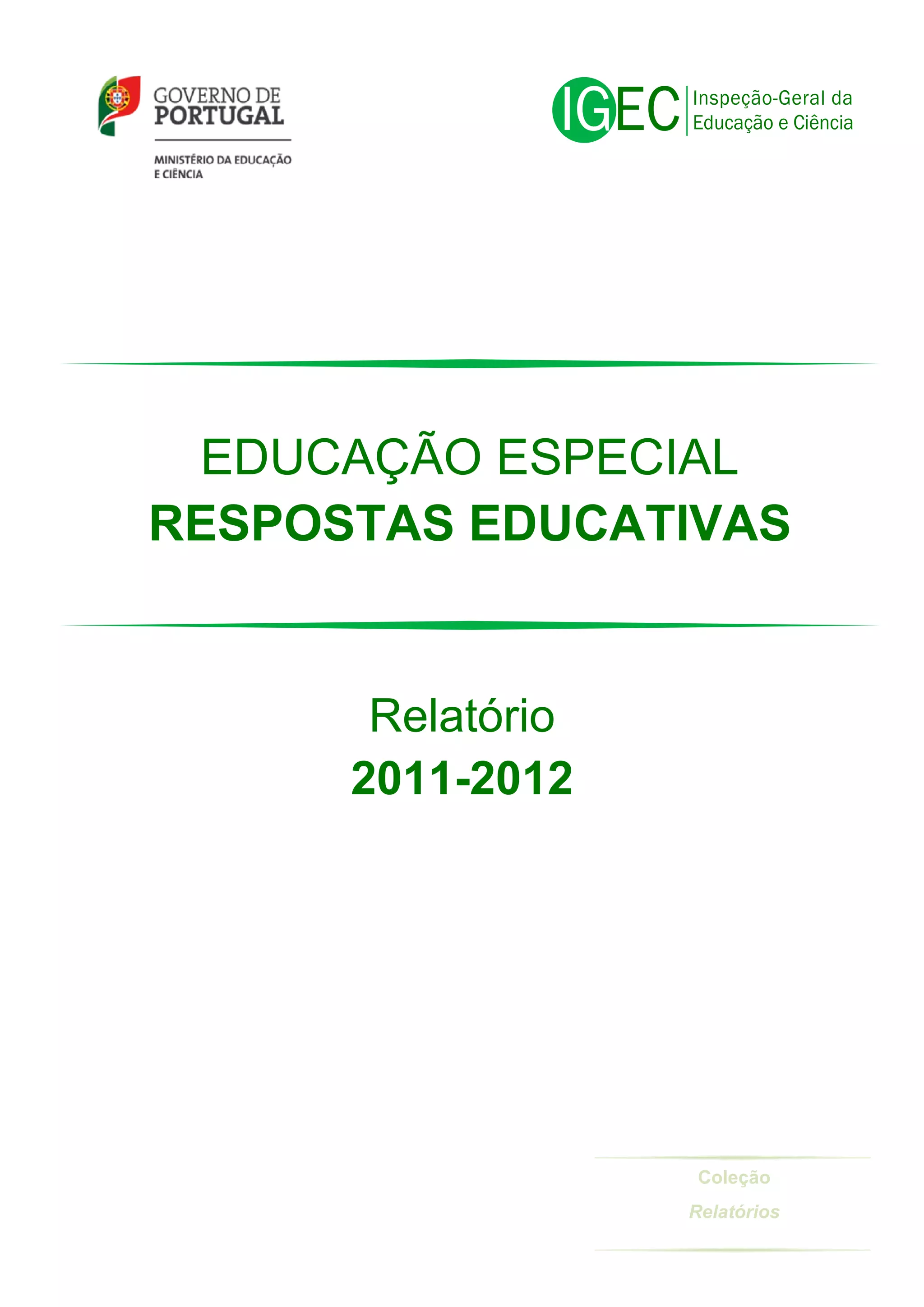 Este relatório descreve as atividades de acompanhamento da Educação Especial desenvolvidas pela IGEC no ano letivo de 2011-2012, abrangendo 97 escolas. A intervenção visou avaliar a organização, planeamento e respostas educativas prestadas, bem como os resultados alcançados pelos alunos. O relatório apresenta a metodologia utilizada, caracteriza as escolas e as respostas educativas, e fornece conclusões e recomendações com base nos resultados obtidos.