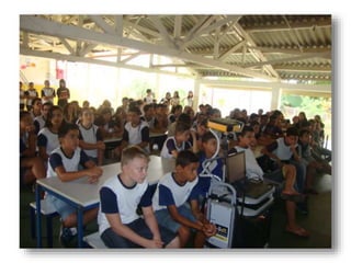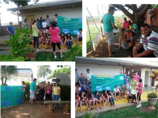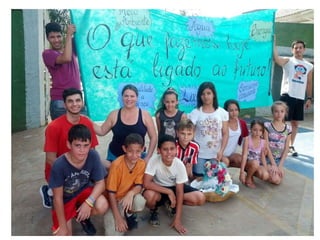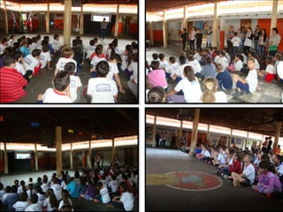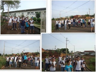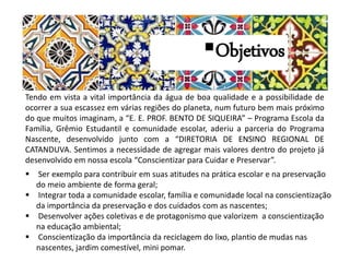 O documento descreve as ações realizadas pela Escola Prof. Bento de Siqueira para aderir ao Programa Nascentes, com o objetivo de conscientizar estudantes e comunidade sobre a importância da preservação de nascentes. As ações incluíram teatro, distribuição de materiais informativos, passeatas e plantio de mudas para sensibilizar, informar e mobilizar sobre a importância de cuidar das nascentes. Todas as atividades foram registradas no blog da escola.