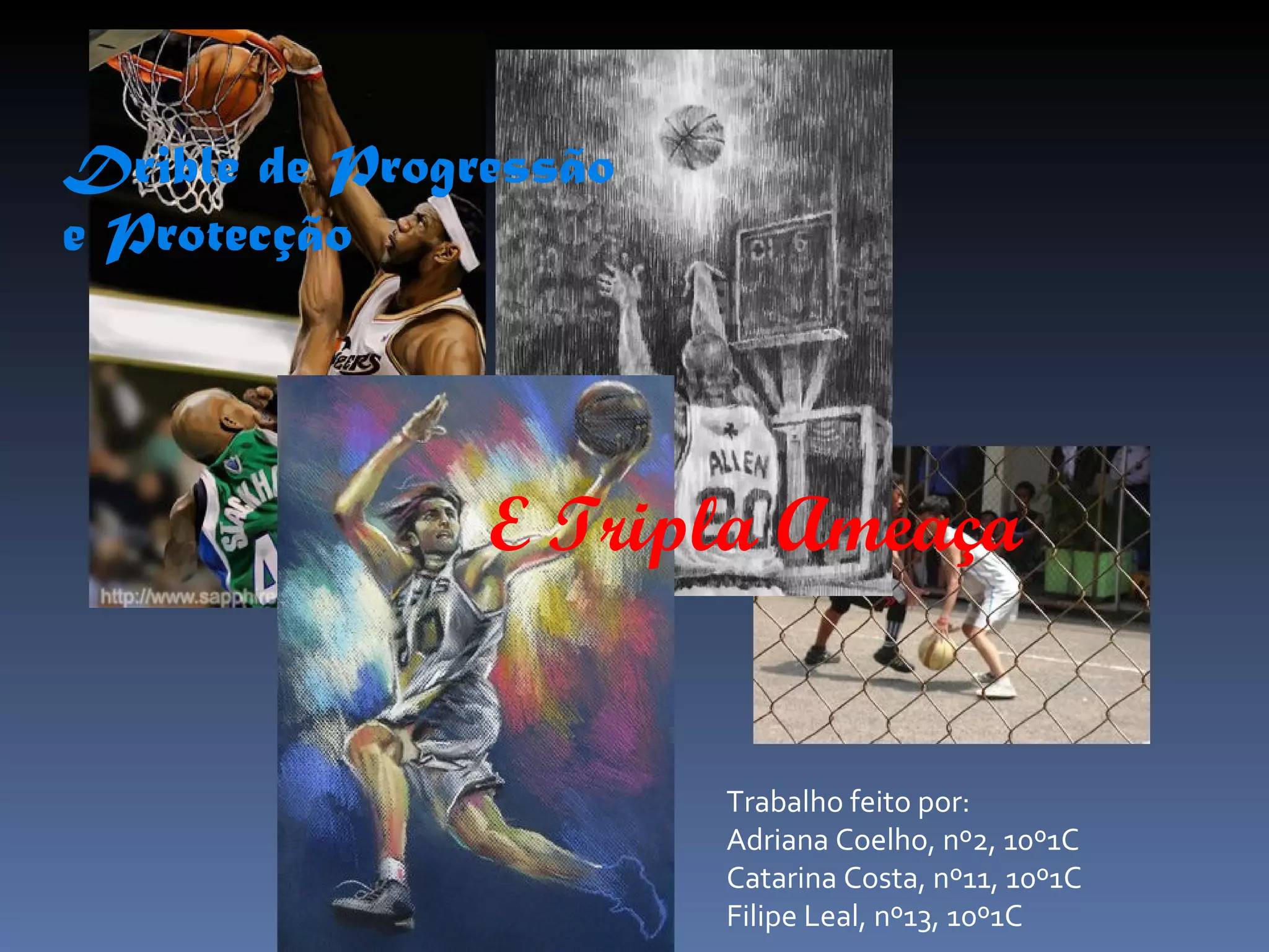 Este documento descreve três fundamentos básicos do basquetebol: 1) o drible de progressão, usado para avançar rapidamente em direção ao cesto adversário mantendo o controle da bola; 2) o drible de proteção, usado quando um adversário impede o progresso e requer proteger mais a bola; e 3) a posição de tripla ameaça, que permite passar, driblar ou lançar ao cesto.