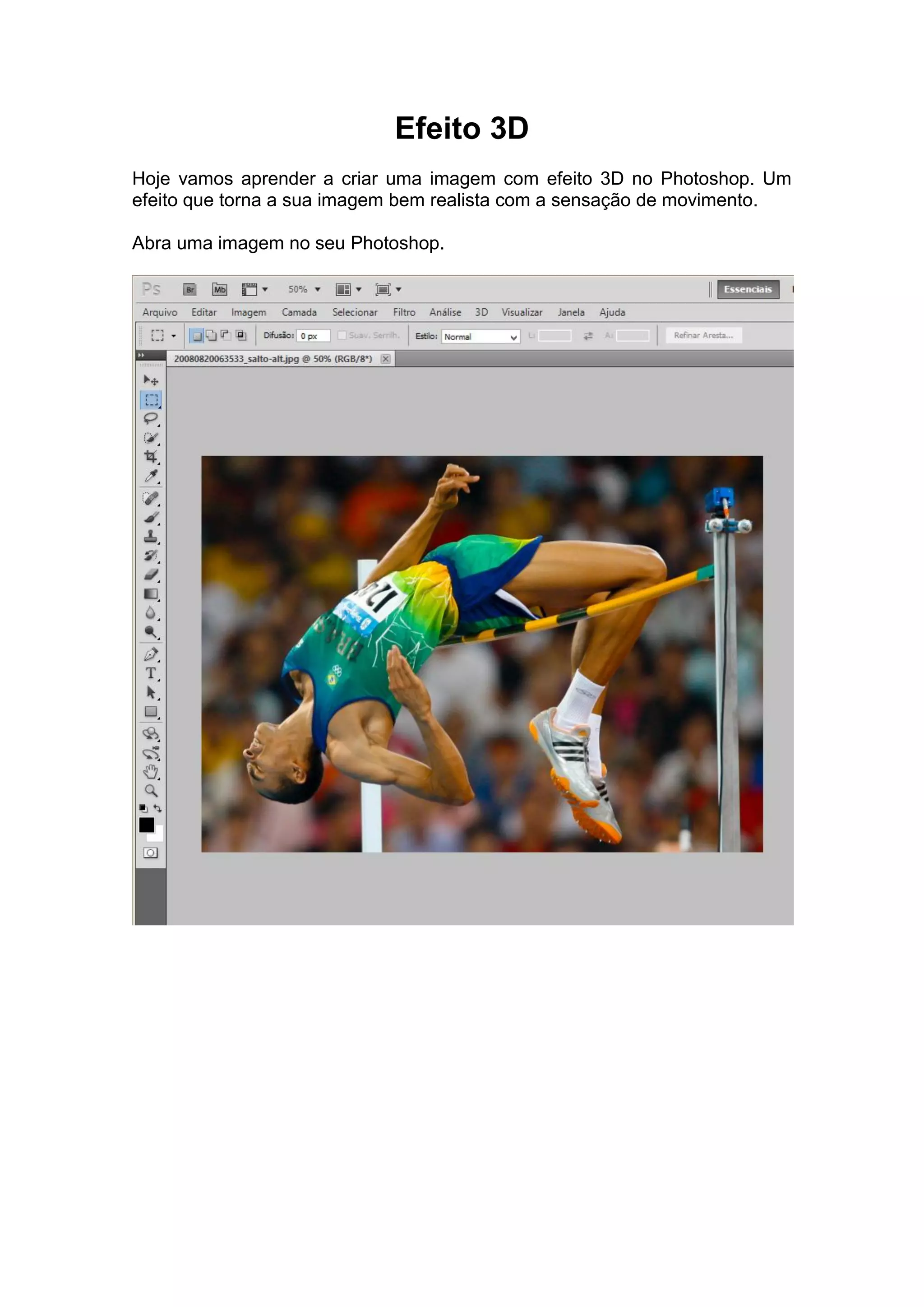 O documento ensina como criar um efeito 3D em uma imagem no Photoshop usando ferramentas de retângulo, preenchimento, transformação de perspectiva e camadas para dar a impressão de profundidade e movimento à imagem.