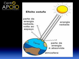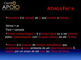 O documento descreve as camadas da atmosfera terrestre, seus principais componentes e fenômenos associados a cada camada. São descritas as camadas Troposfera, Estratosfera, Mesosfera, Termosfera e Exosfera, com detalhes sobre sua composição química, altitude, temperatura e fenômenos como chuvas, aurora boreal e circulação de satélites.