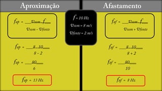 O documento descreve como a frequência de ondas sonoras percebida por um observador muda quando a fonte que emite o som se aproxima ou afasta do observador. Quando a fonte se aproxima, a frequência percebida é maior do que a frequência natural. Quando a fonte se afasta, a frequência percebida é menor do que a frequência natural.