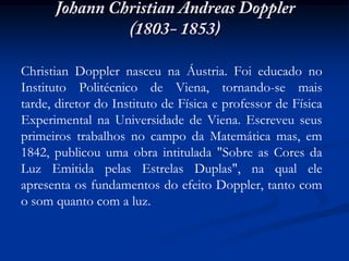Christian Doppler nasceu na Áustria e foi um importante físico que descobriu o efeito Doppler, que é a variação da frequência percebida por um observador em movimento em relação à fonte de ondas. O efeito Doppler ocorre tanto com o som quanto com a luz e depende da aproximação ou afastamento entre a fonte e o observador. A equação do efeito Doppler relaciona a frequência emitida com a frequência observada.