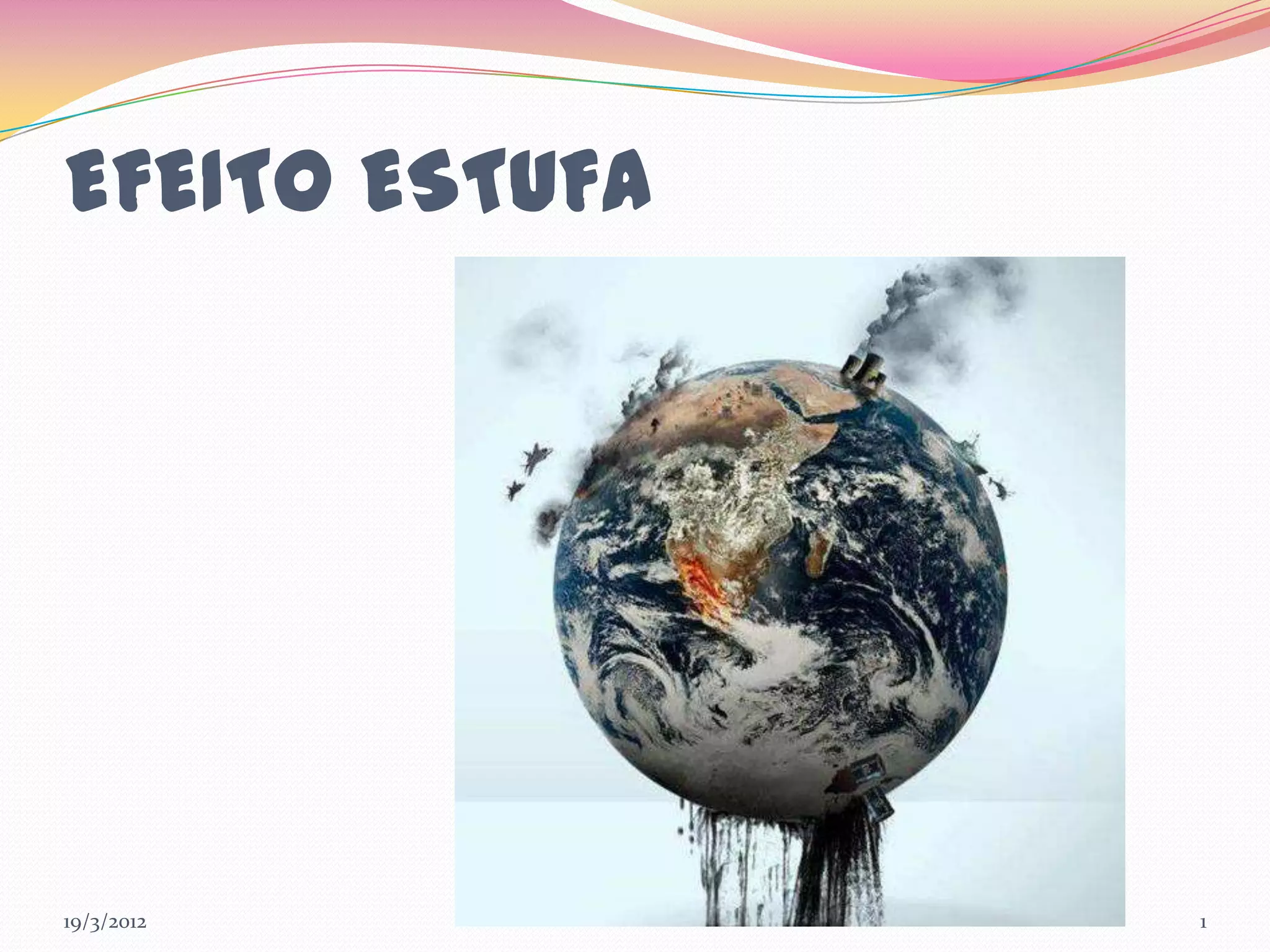 O documento descreve o efeito estufa natural e como as atividades humanas o estão exacerbando, levando a mudanças climáticas como aumento da temperatura global e degelo polar. O efeito estufa ocorre quando os gases de efeito estufa retêm parte do calor emitido pela Terra, aquecendo a atmosfera. As principais fontes humanas desses gases são a queima de combustíveis fósseis e o desmatamento.
