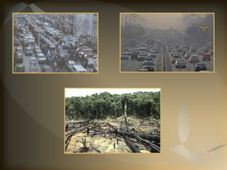 O documento explica o que é o efeito estufa, como um fenômeno natural agravado pelo homem através da emissão de gases. Detalha as principais causas humanas como o uso de combustíveis fósseis, as consequências como o aquecimento global, e possíveis soluções como o uso de energias renováveis.