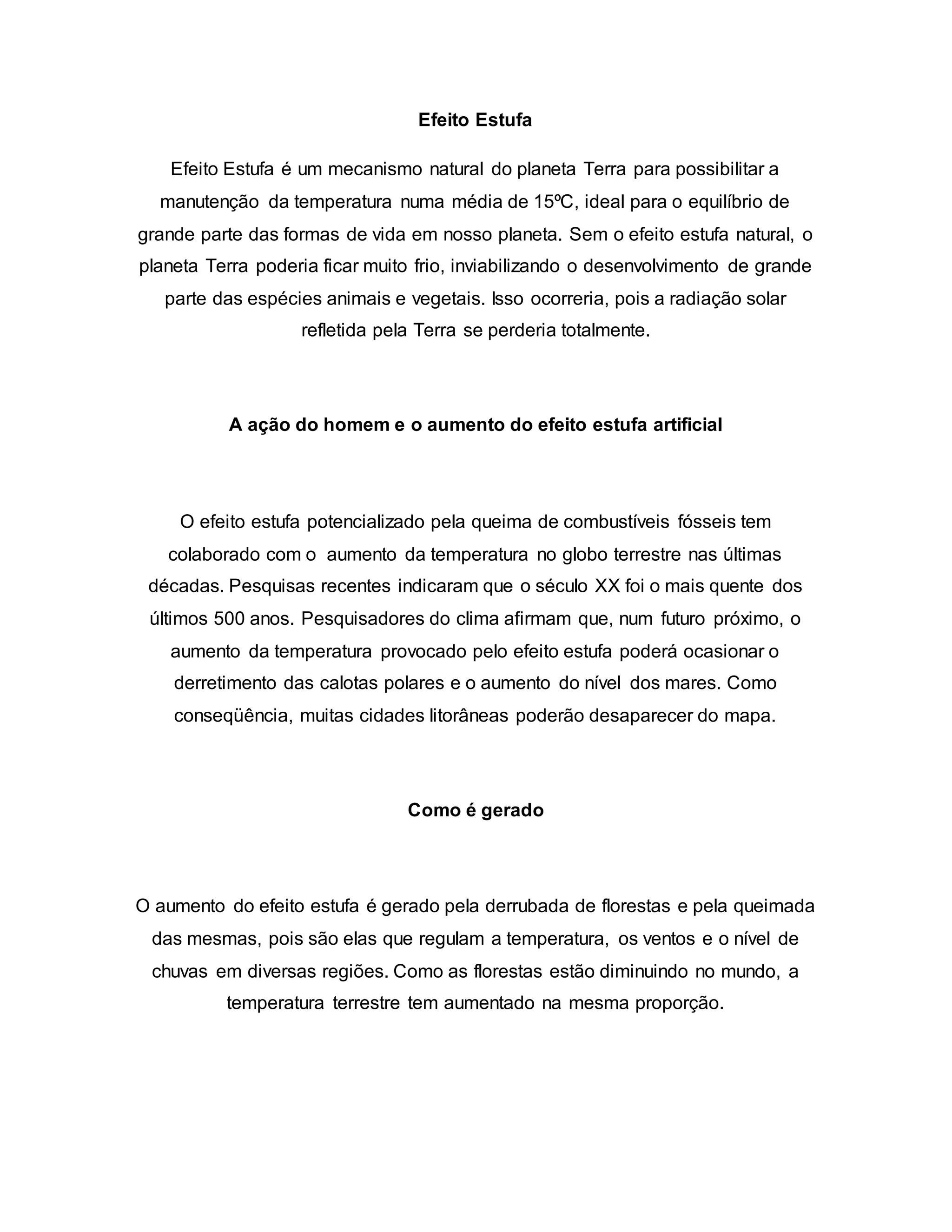 O efeito estufa natural mantém a temperatura da Terra em média em 15°C, mas as atividades humanas como queima de combustíveis fósseis aumentaram o efeito estufa artificialmente, levando a um aquecimento global. Isso pode derreter geleiras, elevar o nível do mar e ameaçar cidades costeiras. A derrubada de florestas, que regulam o clima, e a emissão de gases como dióxido de carbono também contribuem para o aumento do efeito estufa.